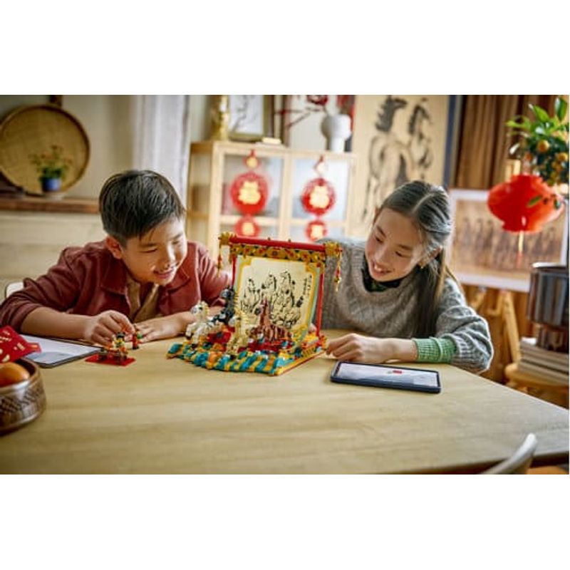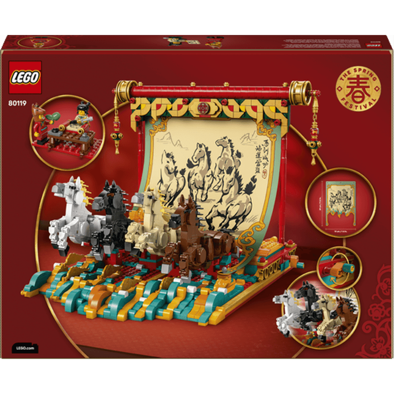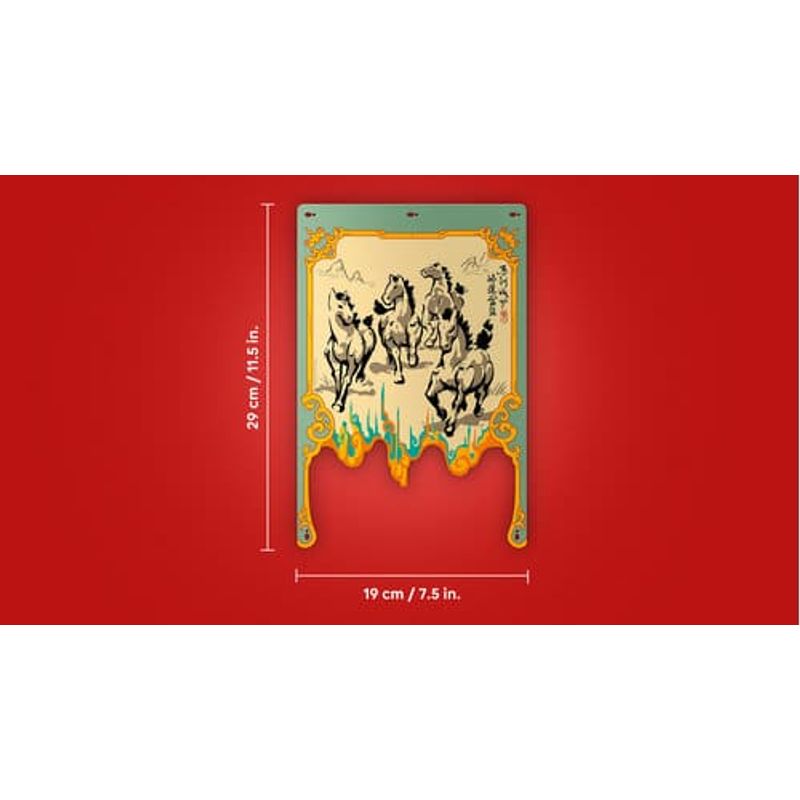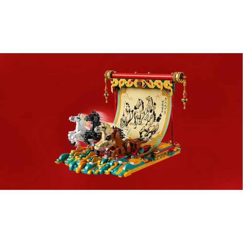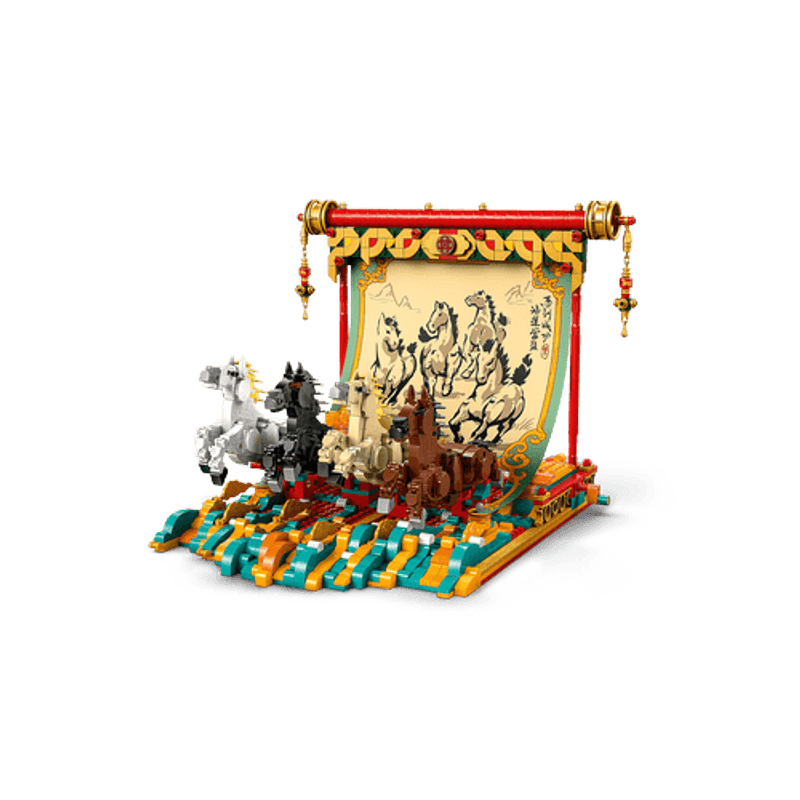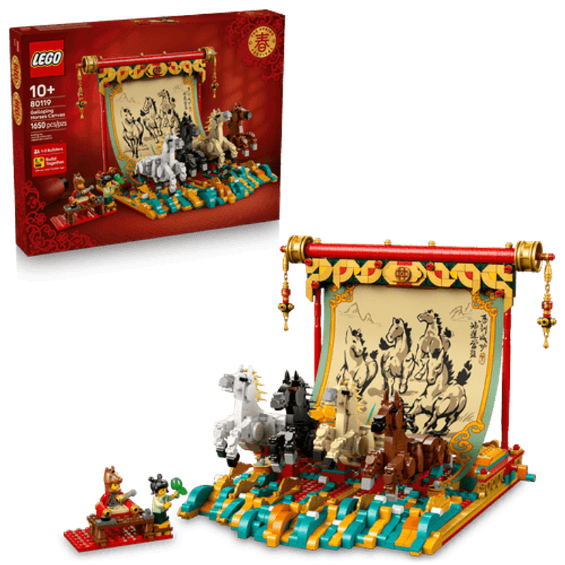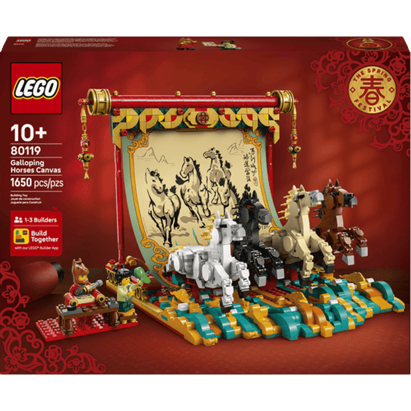 Muestra el arte y la delicadeza de la pintura tradicional con pincel a través de este modelo inspirado en la Fiesta de la Primavera. Cuelga el lienzo de los caballos galopantes. Coloca las 4 patas de estos bellos animales y gira la palanca para darles movimiento. Incorpora la escena de las 2 minifiguras pintando. Y, con el modo Construye en Compañía de la app LEGO Builder, ¡créalo en equipo!