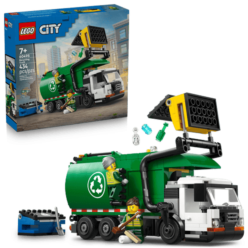 Ya llegó el Camión de Reciclaje LEGO® City, ¡y está equipado con fantásticas funciones! Desliza la palanca para seleccionar los compartimientos de vidrio o papel, y luego usa las horquillas para levantar y vaciar los contenedores en el camión. Conduce a tu destino y descarga los residuos clasificados. Guarda las herramientas e inclina la cabina para revisar el motor antes de tu próximo trabajo.