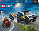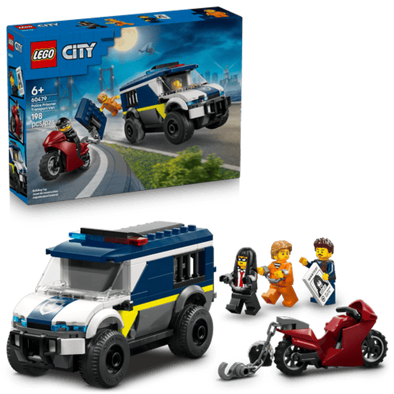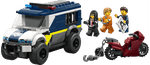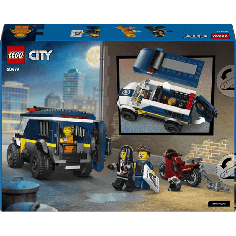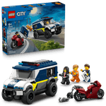 Haz sonar la alarma: ¡hubo una fuga! Sube al ladrón a la Camioneta de Transporte Penitenciario de Policía LEGO® City y llévalo a la prisión más cercana. Pero cuidado: su cómplice tiene una moto rapidísima y un astuto plan para enganchar y arrancar la puerta de la celda. ¿El policía conductor impedirá que escapen? ¡La decisión es tuya! Te esperan épicas huidas y aventuras en LEGO City.