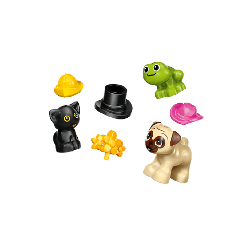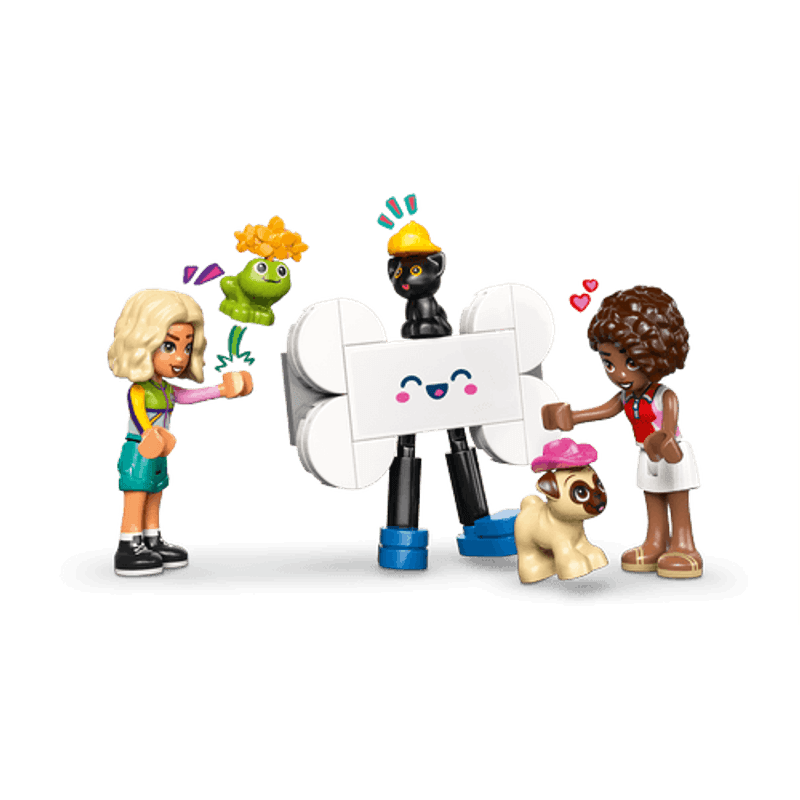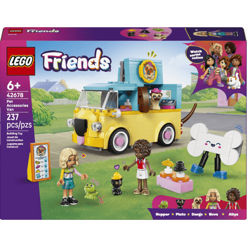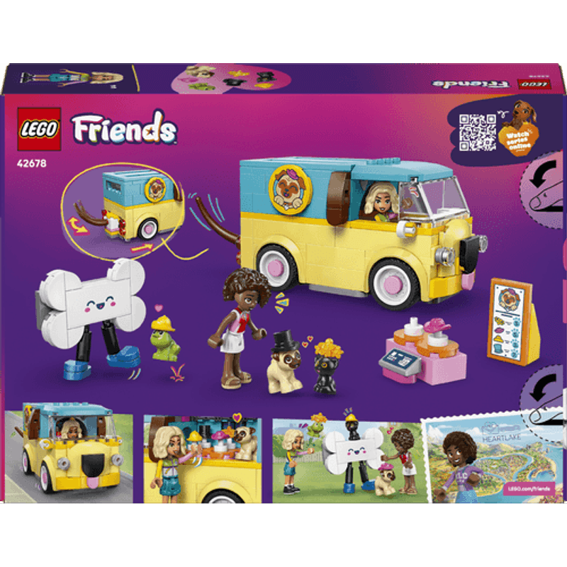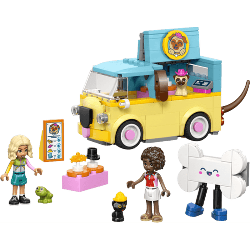 ¡La Camioneta de Accesorios Caninos LEGO® Friends está en camino! Ayuda al gatito, al perro y a la rana a encontrar el accesorio perfecto. El vehículo tiene un adorable diseño con forma de pug. Fíjate, ¡incluso mueve la cola! Abre la camioneta para mostrar los accesorios y crear una divertida exhibición, ¡y luego organiza un desfile de moda para mascotas!