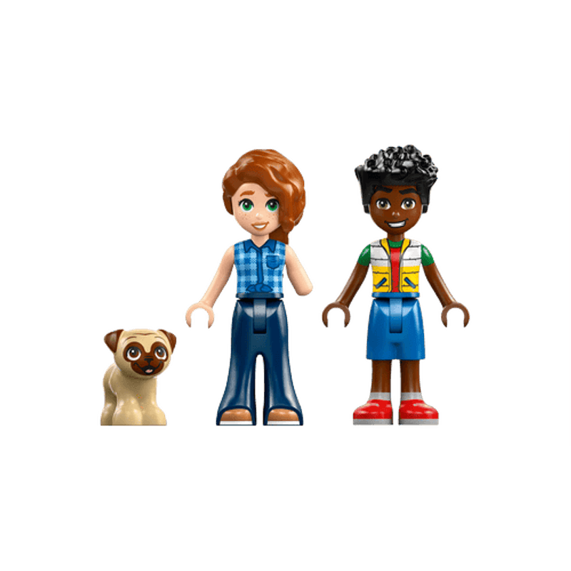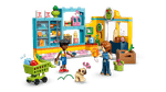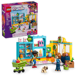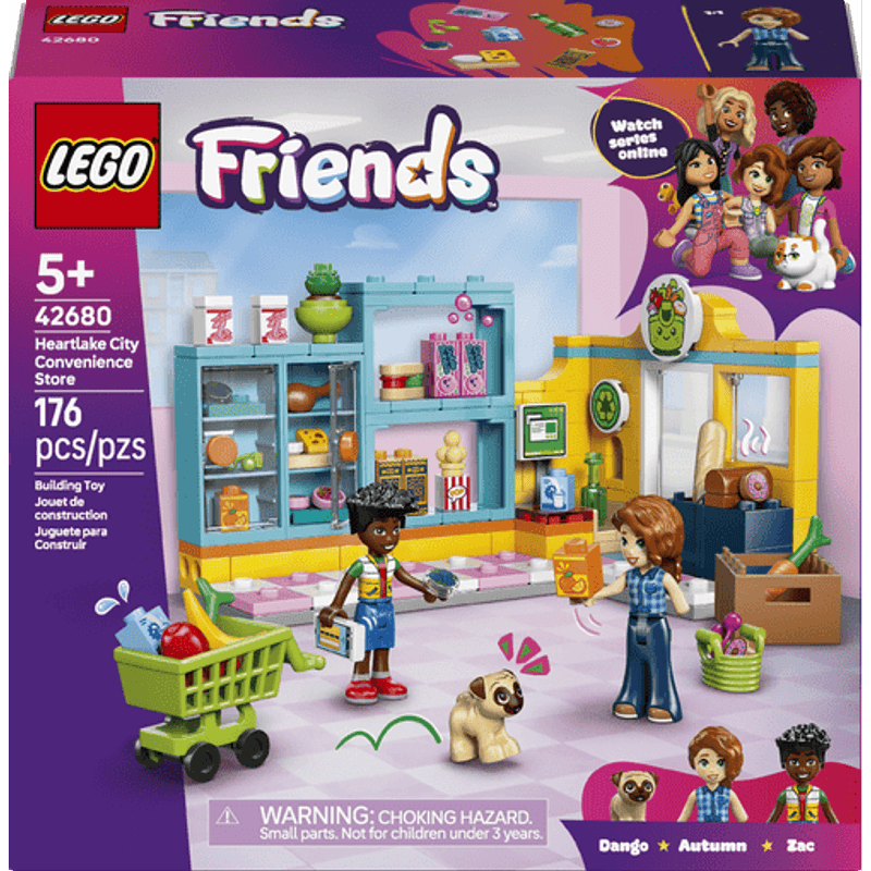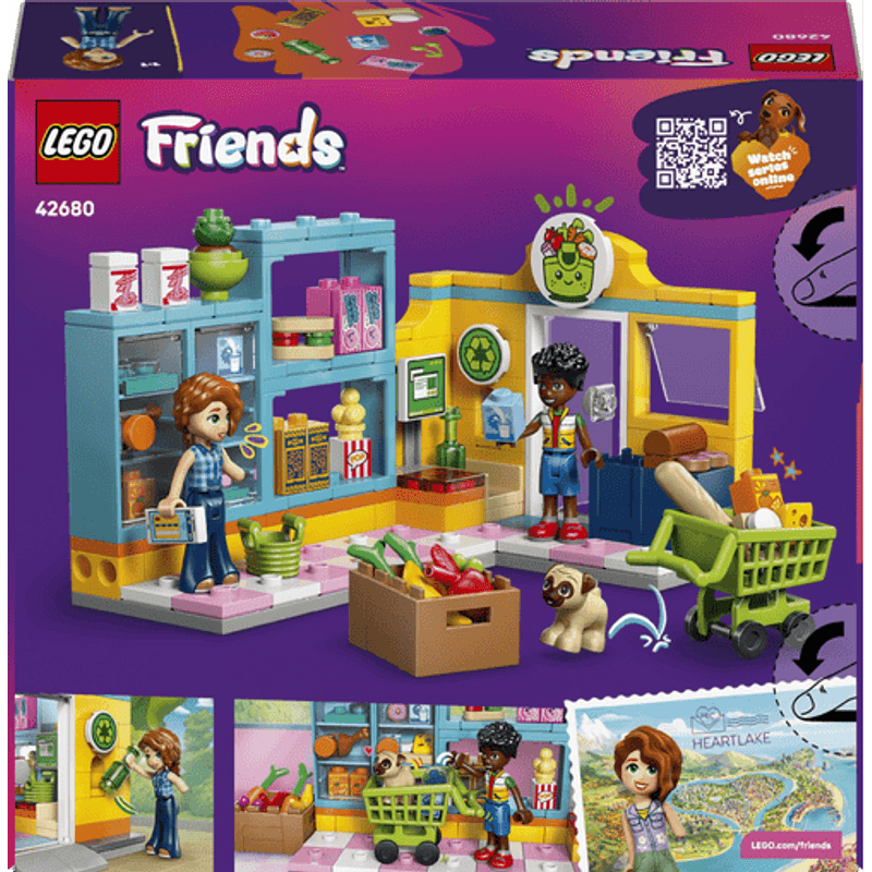 ¡Vamos a comprar comida! La Tienda de Abarrotes de Heartlake City LEGO® Friends tiene de todo. Mira, el perro Dango está ahí, con Autumn y Zac, que tomaron el carrito de compras para cargarlo con su comida favorita. Seguro que eligen donas, fruta, jugo, zanahorias y leche. Después de pagar los artículos, irán a la estación de reciclaje para reciclar una botella vacía. ¡Qué visita al súper tan divertida!