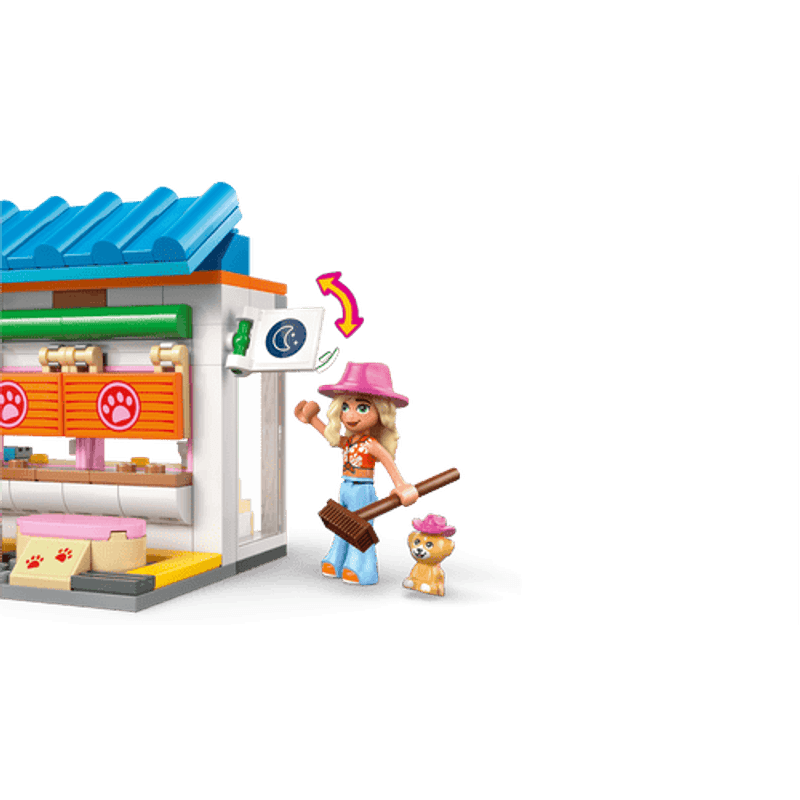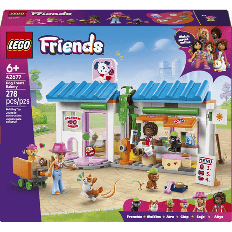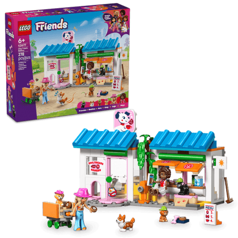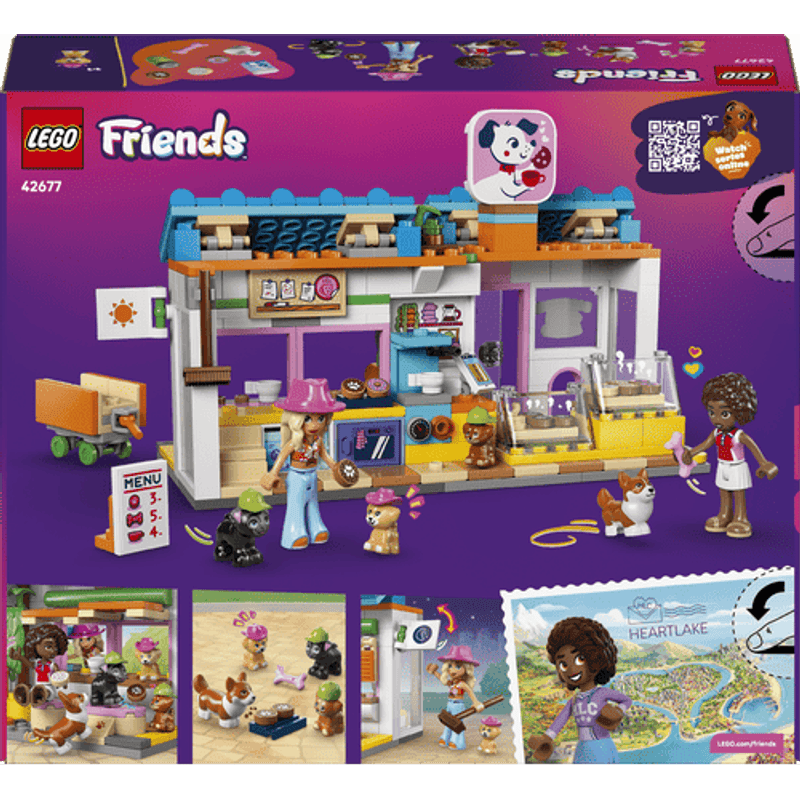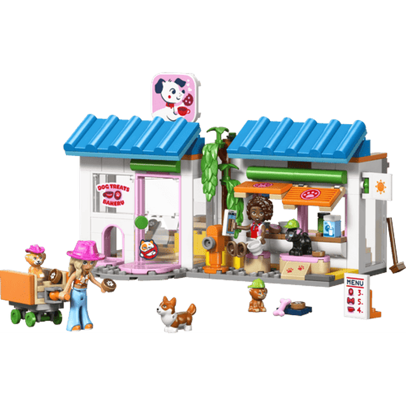 ¿Te apuntas a la diversión peluda de la Pastelería de Dulces Caninos LEGO® Friends? A Aliya, Sage y sus mascotas les encanta. Los perros reciben una bienvenida especial: ¡entran por su propia puerta! También hay una transportadora para los cachorros. Incluso pueden ayudar a servir subiendo al mostrador por la rampa. La cocina tiene de todo para preparar dulces para los perros… ¡y sus humanos! ¡Guau!