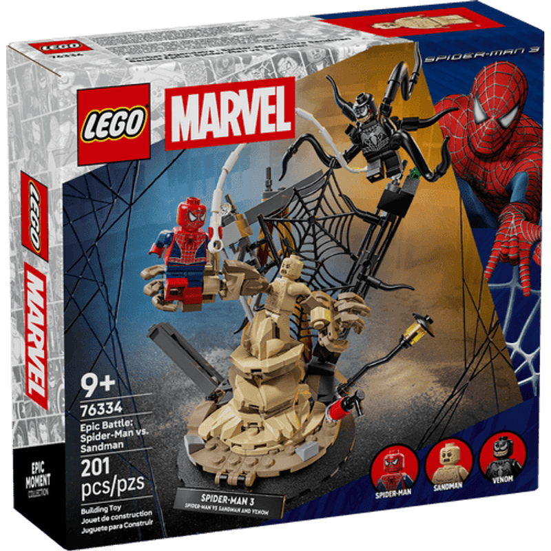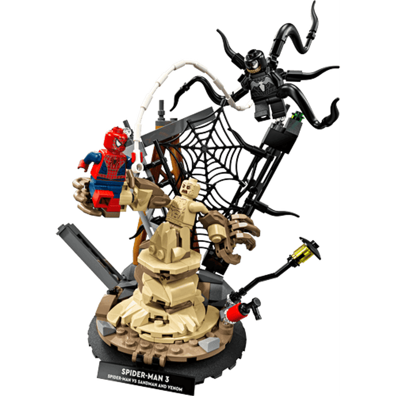 ¡Entra en acción con una aventura construible extraída directamente de Spider-Man 3, de Marvel Studios! Cuando Sandman emerge de los escombros, Spider-Man se acerca balanceándose en una cuerda arácnida para acabar con él. Pero ahí está Venom, con sus tentáculos listos para atacar. ¿Qué pasará? Exhibe el modelo en tu cuarto o separa las minifiguras para vivir tus propias historias de superhéroes.