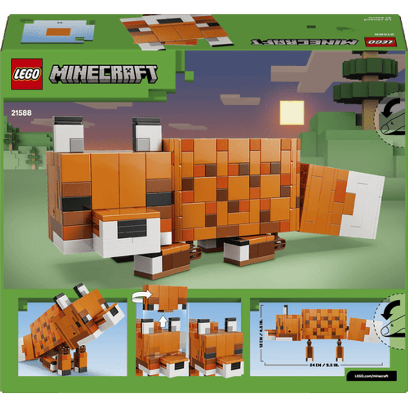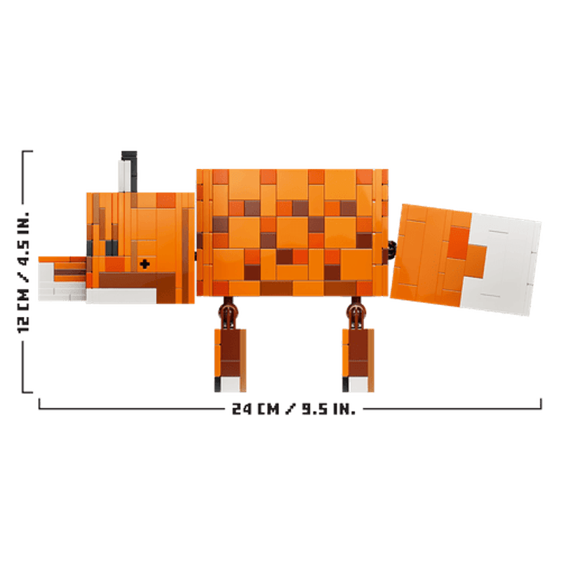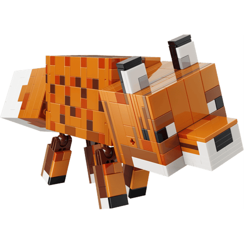 ¡Prepárate para divertirte al estilo Minecraft® con tu propio zorro gigante! Colócalo de pie, sentado o recostado, como en el videojuego. Puedes girarle la cabeza, moverle las piernas e incluso cambiarle los ojos abiertos por unos cerrados para mostrarlo despierto o dormido. Será como dar vida a un zorro, ¡tu criatura favorita!