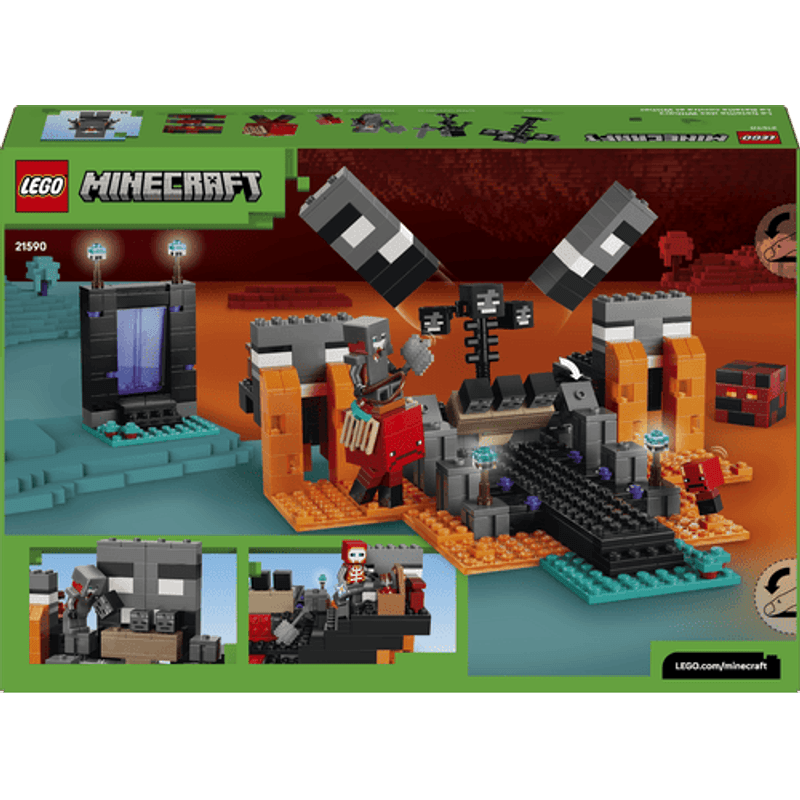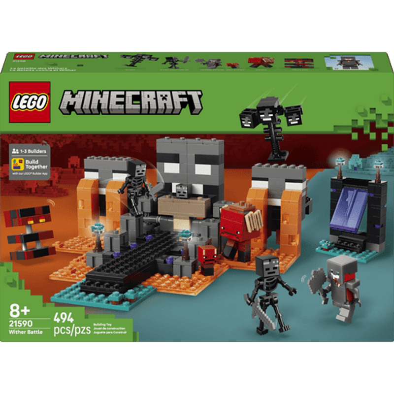 Atraviesa el portal del Nether y sumérgete en épicas aventuras en el santuario del Wither. ¡Pelea contra los esqueletos de Wither, monta en un Caminante por la lava e invoca al Wither con una explosión sorpresa! ¿Lograrás conquistar el santuario o caerás ante el jefe Wither? Y, con el modo Construye en Compañía de la app LEGO® Builder, tus amigos y familiares podrán unirse a la diversión creativa.