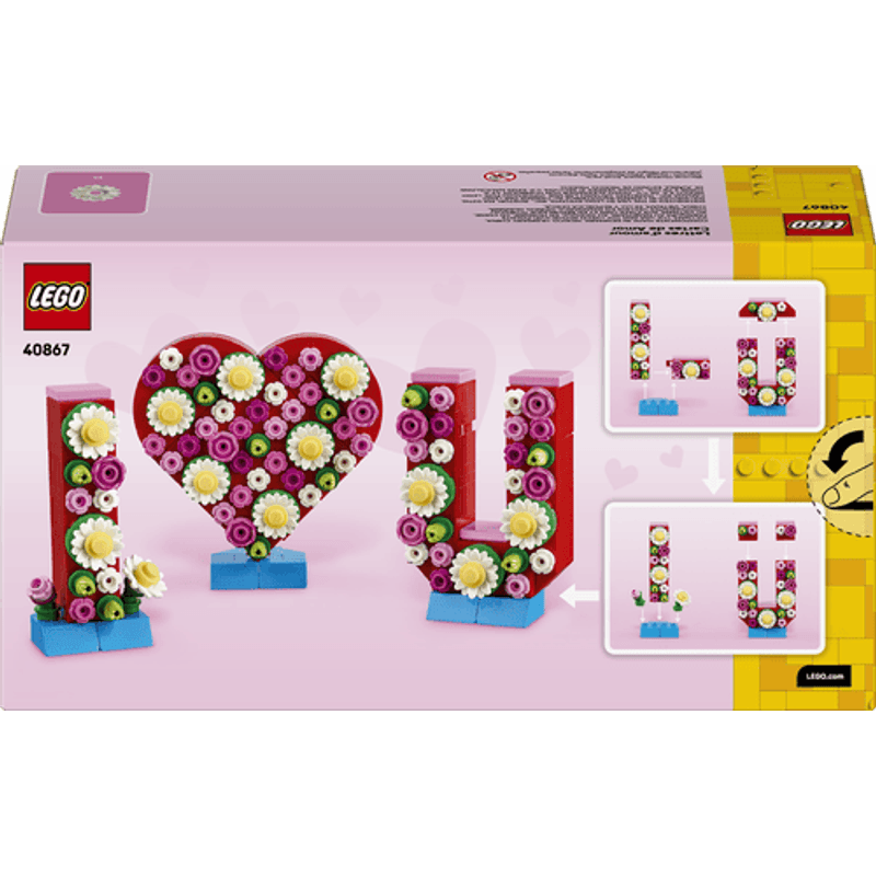 Difunde el amor en tu hogar y entre tu familia con el encantador set LEGO® Letras del Amor. Construye las letras y decóralas usando los coloridos bricks de flores. Ofrécelas como regalo por San Valentín, el Día del Padre o el Día de la Madre, o quédatelas para decorar tu habitación. Intercambia las letras para decirle a alguien especial que lo quieres.