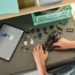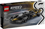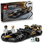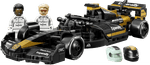 El auto de F1 de juguete incorpora detalles de diseño iguales a los de la película, como sus colores distintivos en negro y dorado, calcomanías de los patrocinadores y llantas traseras más anchas impresas con la marca “Pirelli”. El set viene con 2 minifiguras de personajes de la película: los pilotos de F1 Sonny Hayes y Joshua Pearce, cada uno con cascos individuales decorados con su firma, una peluca y una llave de tuercas.
